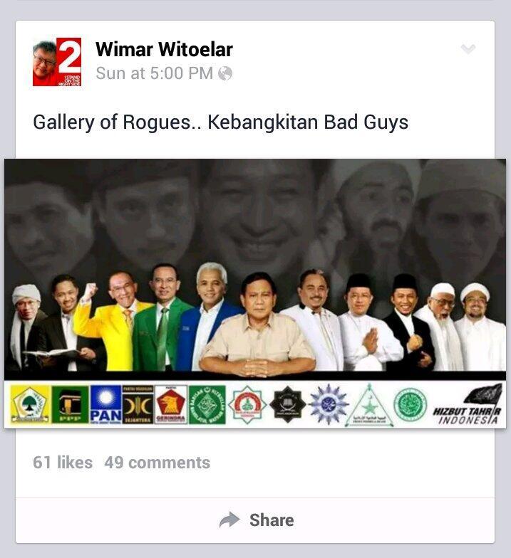 Jakarta - Wimar mengunggah foto barisan pendukung Prabowo-Hatta dengan latar belakang teroris dan Presiden Soeharto. Dalam gambar itu juga terdapat logo beberapa ormas Islam, salah satunya Muhammadiyah. Wimar dituntut minta maaf.