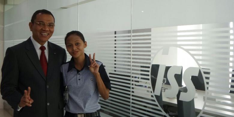 President Director & CEO ISS Indonesia Elisa Lumbantoruan dan pegawainya, Karlina yang bertugas sebagai cleaning service, Rabu (11/5/2016).