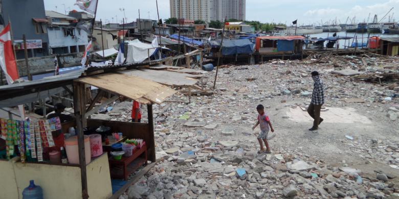 Hampir sebulan setelah penertiban Pasar Ikan, Penjaringan, Jakarta Utara, warga Pasar Ikan masih bertahan di tenda pengungsian yang didirikan di atas puing bangunan rumah mereka.